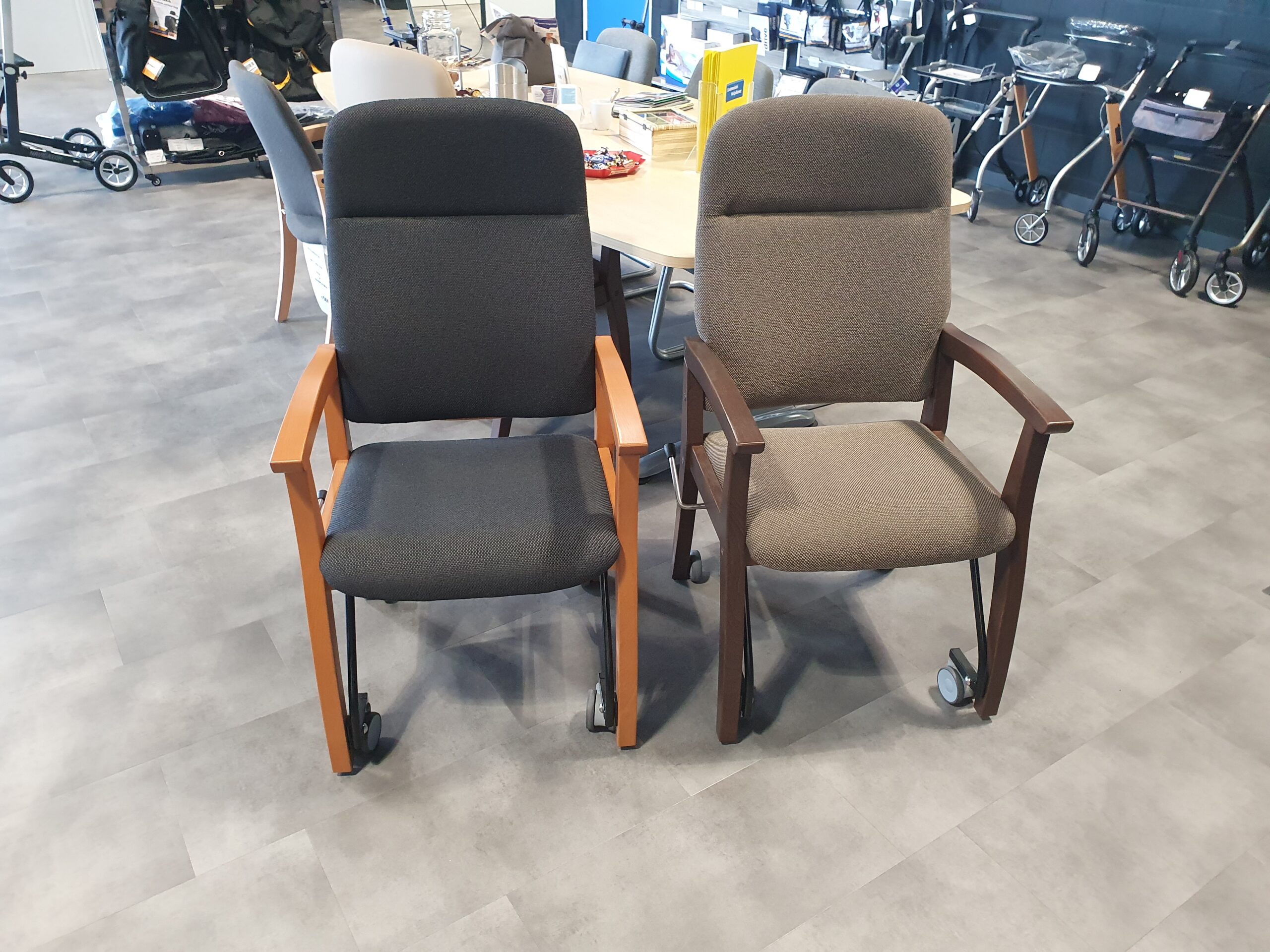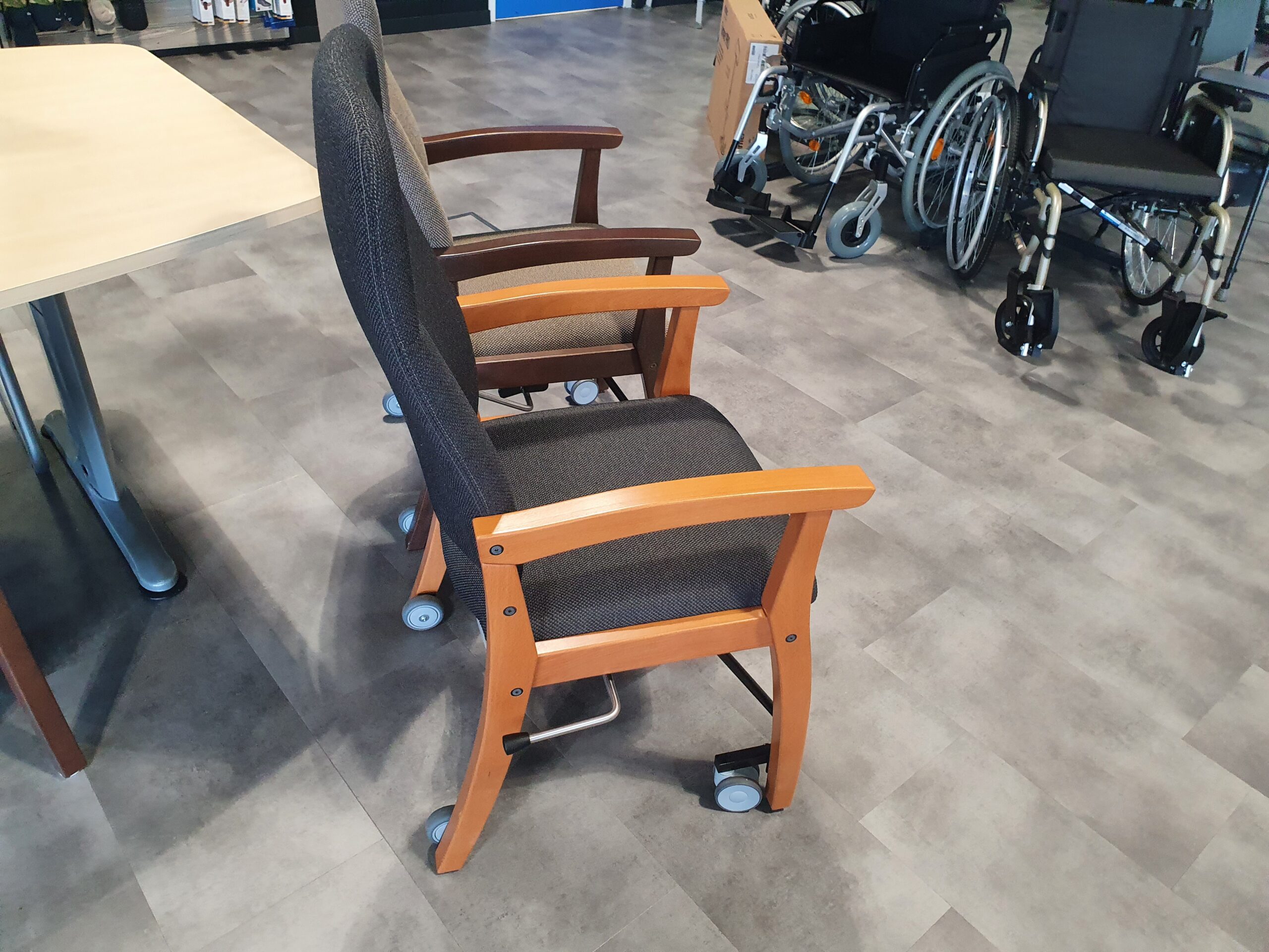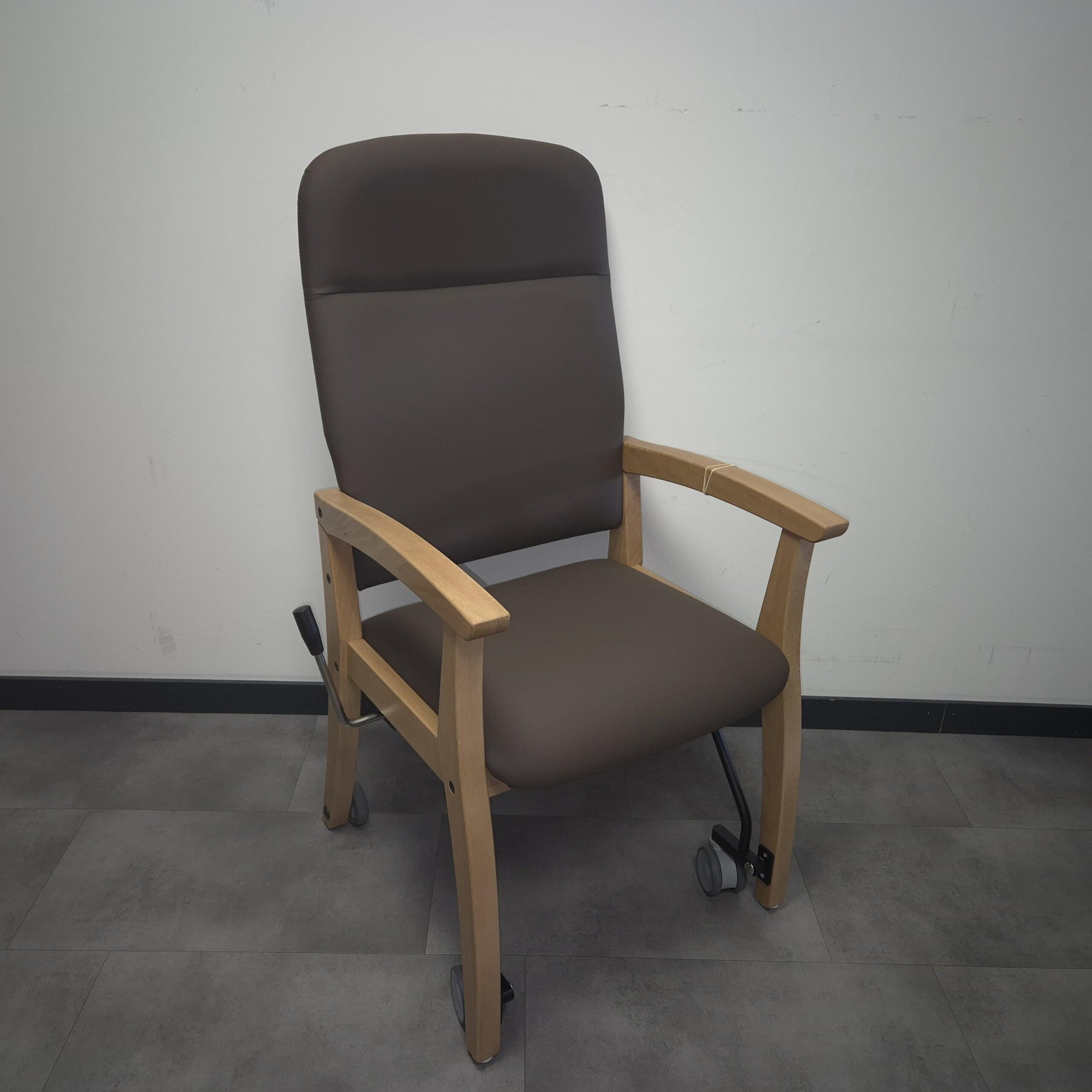 De aanschuifstoel / senioren eetkamerstoel Ab heeft een heerlijke zit met een hoge zorg rug voor een juiste ondersteuning. De stoel staat standaard op de poten maar kan door de hendel die zeer licht te bedienen is iets op de wielen getild worden waardoor de stoel verrijdbaar wordt, zodat u zelf of door een begeleider iets naar achteren kan worden gehaald zodat u ruim de ruimte heeft om uit te stappen en u met het aan tafel gaan goed kunt worden aangeschoven zonder dat dit veel kracht en inspanning kost. Tijdens de transfer in en uit de stoel zet u de stoel door middel van de hendel weer met de poten op de grond, zodat u veilig in en uit kunt stappen zonder dat de stoel kan verschuiven.