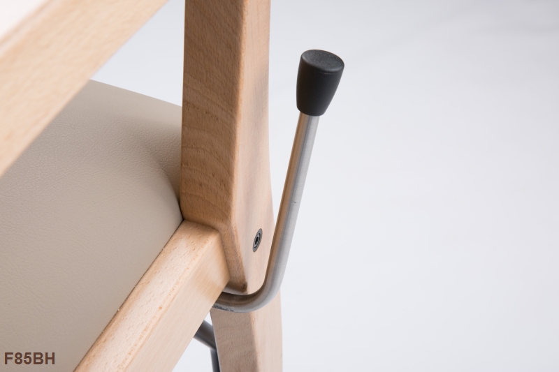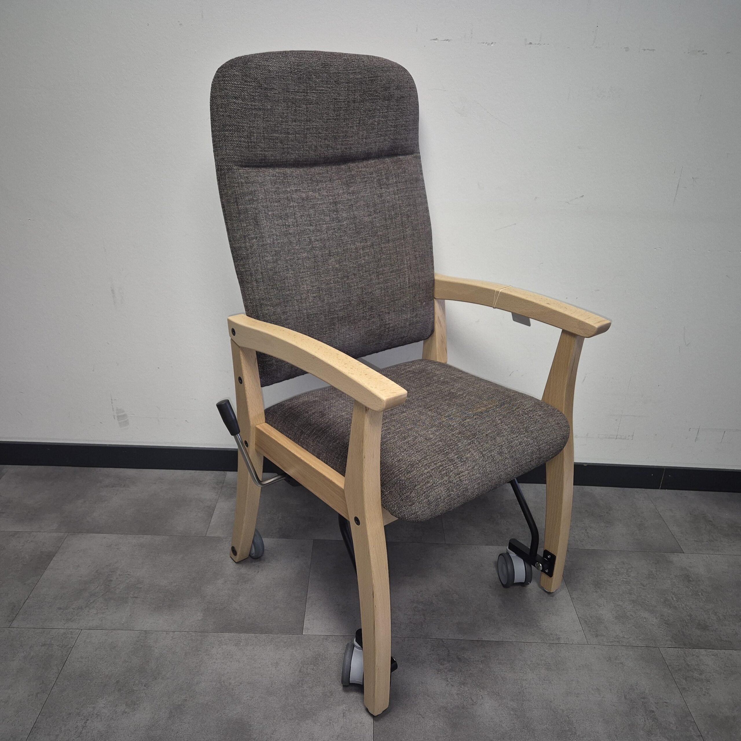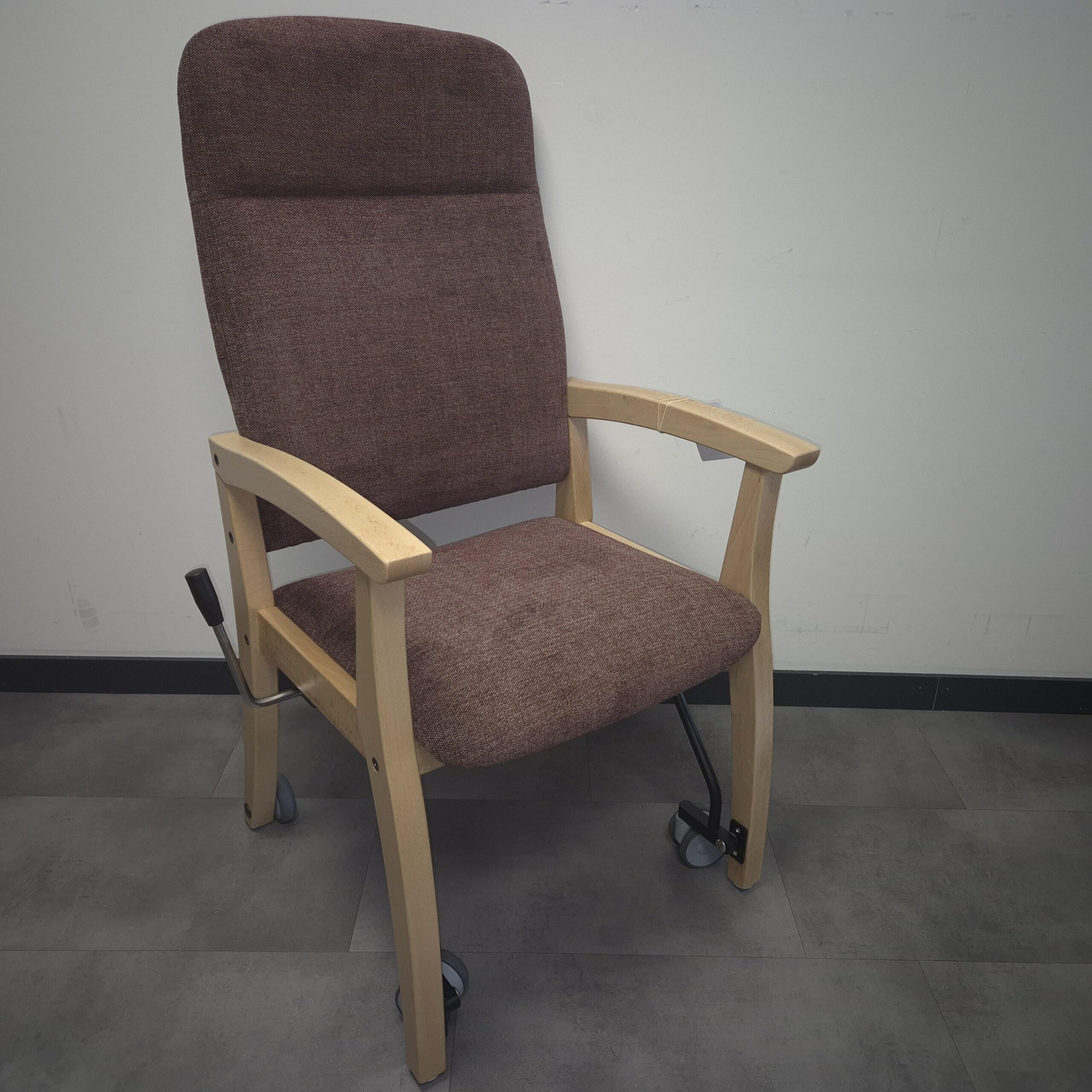 De aanschuifstoel / senioren eetkamerstoel Ab heeft een heerlijke zit met een hoge rug voor een juiste ondersteuning. De stoel staat standaard op de poten maar kan door de hendel die zeer licht te bedienen is iets op de wielen getild worden waardoor de stoel verrijdbaar wordt.