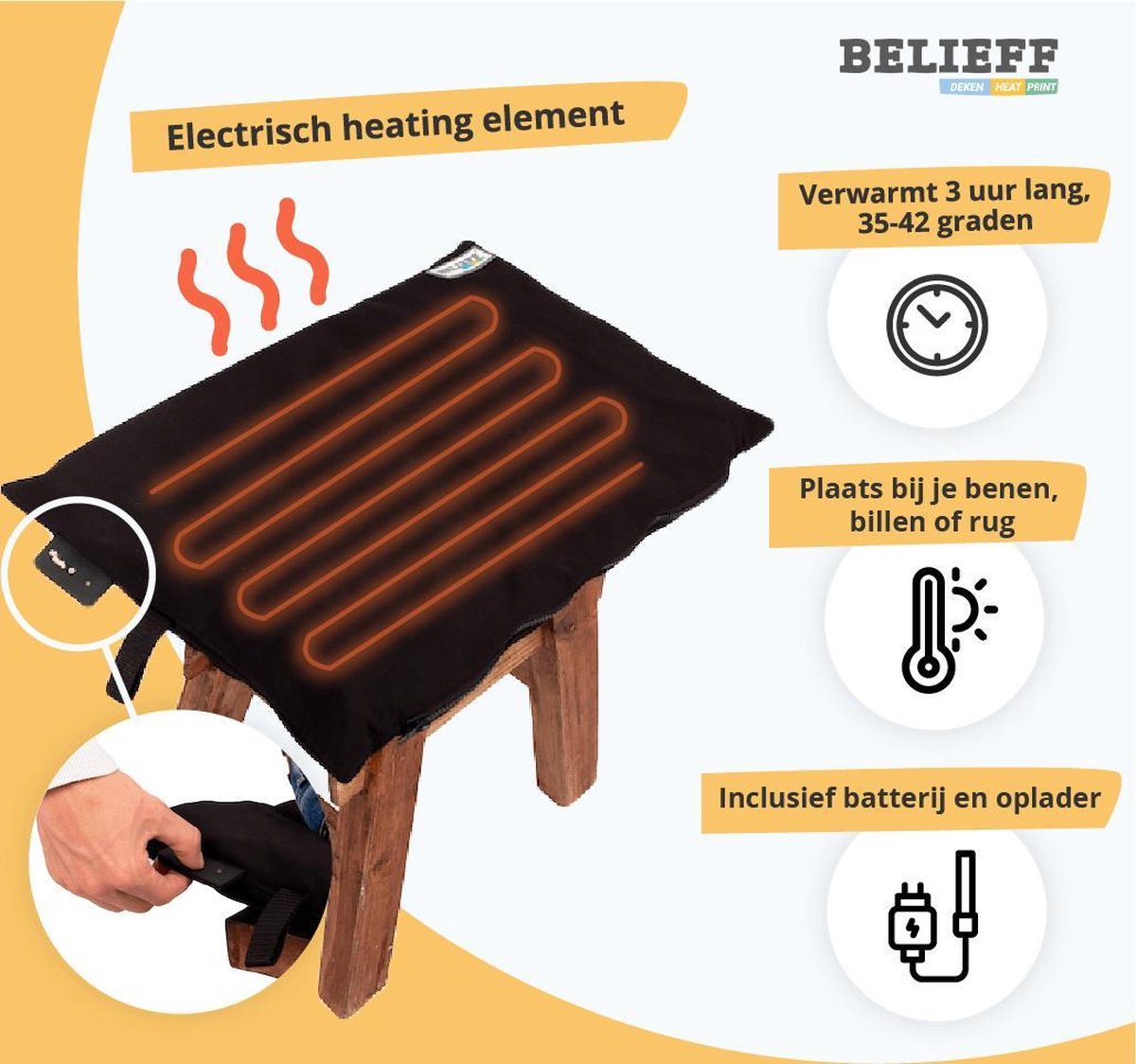 Het Belieff elektrische verwarmins Pad voor rolstoel en scootmobiel zit in een waterdichte en afneembare hoes en is daardoor zeer geschikt voor outdoor gebruik in de rolstoel of op de scootmobiel. De elektrische heating is voorzien van een batterij die zorgt dat je lichaam tot max. 42 graden en 3 uur verwarmd wordt. De draadloze verwarmings pad is voorzien van een band waarmee hij aan de deken bevestigd kan worden. Ook wordt deze veel toegepast als lof warmte kussen in de rug of om op te zitten. Met de bijgeleverde oplader laad u het verwarmingspad weer snel op voor de volgende tocht.