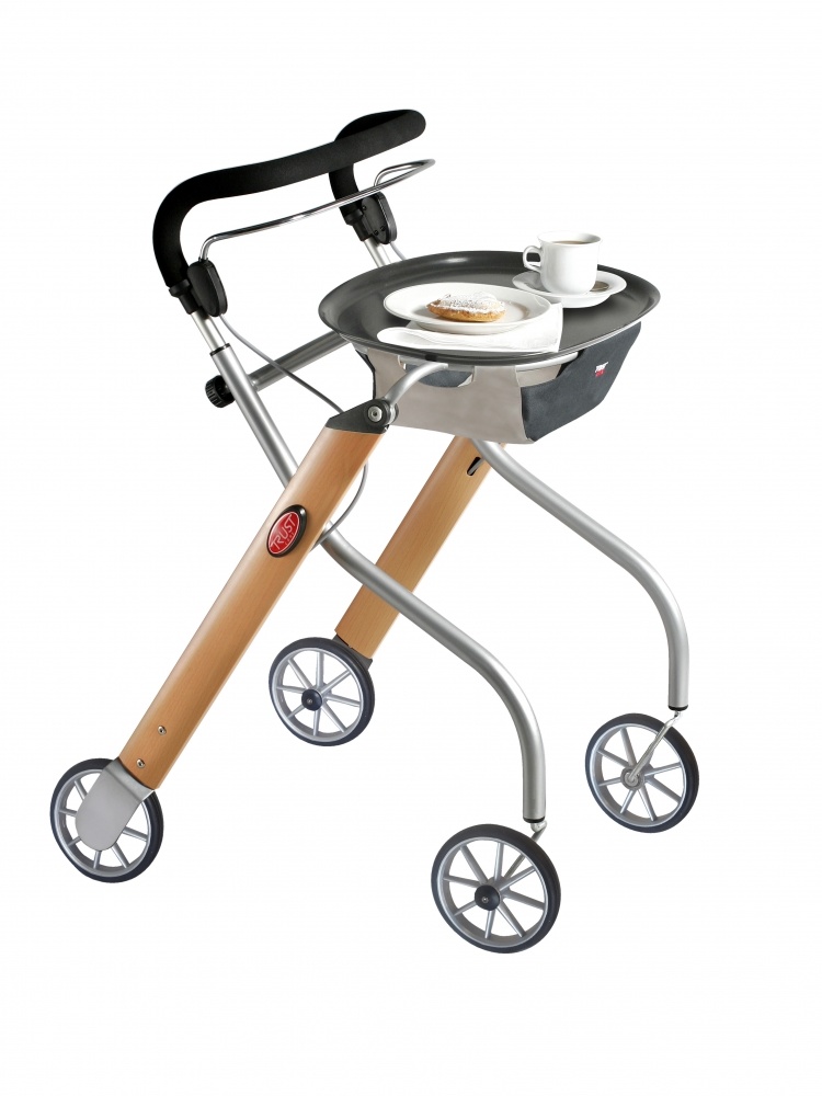 De rollator word standaard geleverd zonder de tas onder het dienblad