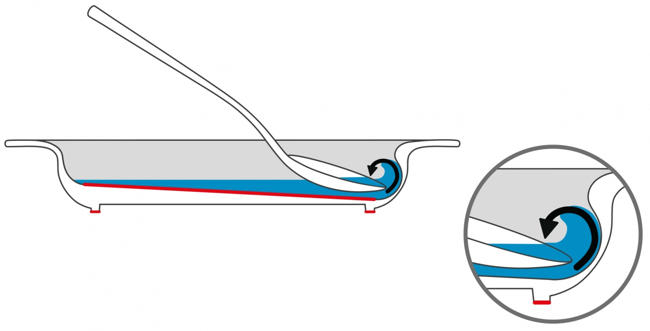 - Een onopvallende naar binnenvallende rand waardoor het eten terug valt op de lepel.