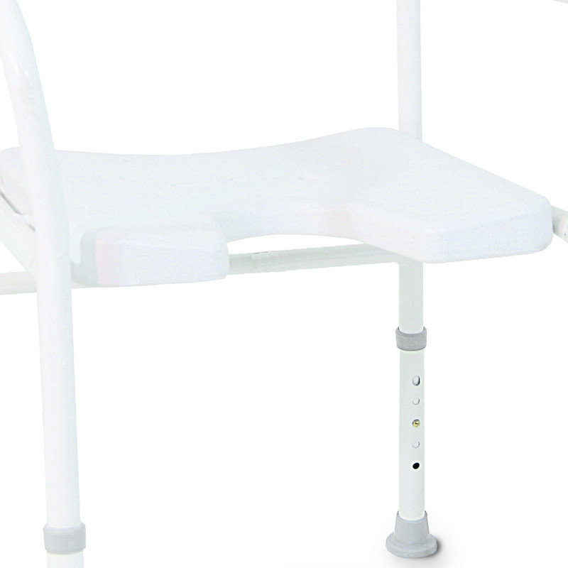De zitting is voorzien van kleine gaatjes, hierdoor loopt het water makkelijk weg en blijft het niet op de zitting staan. Op de zitting zit een fijne antislip coating waar u geen hinder van ondervind. Door deze coating word glijden voorkomen. In de zitting zit een hygiëne uitsparing zodat u of uw hulpverlener ook gemakkelijk de intieme delen kan bereiken. De zithoogte is naar wens in te stellen van 42 t/m 52 cm in 5 posities .