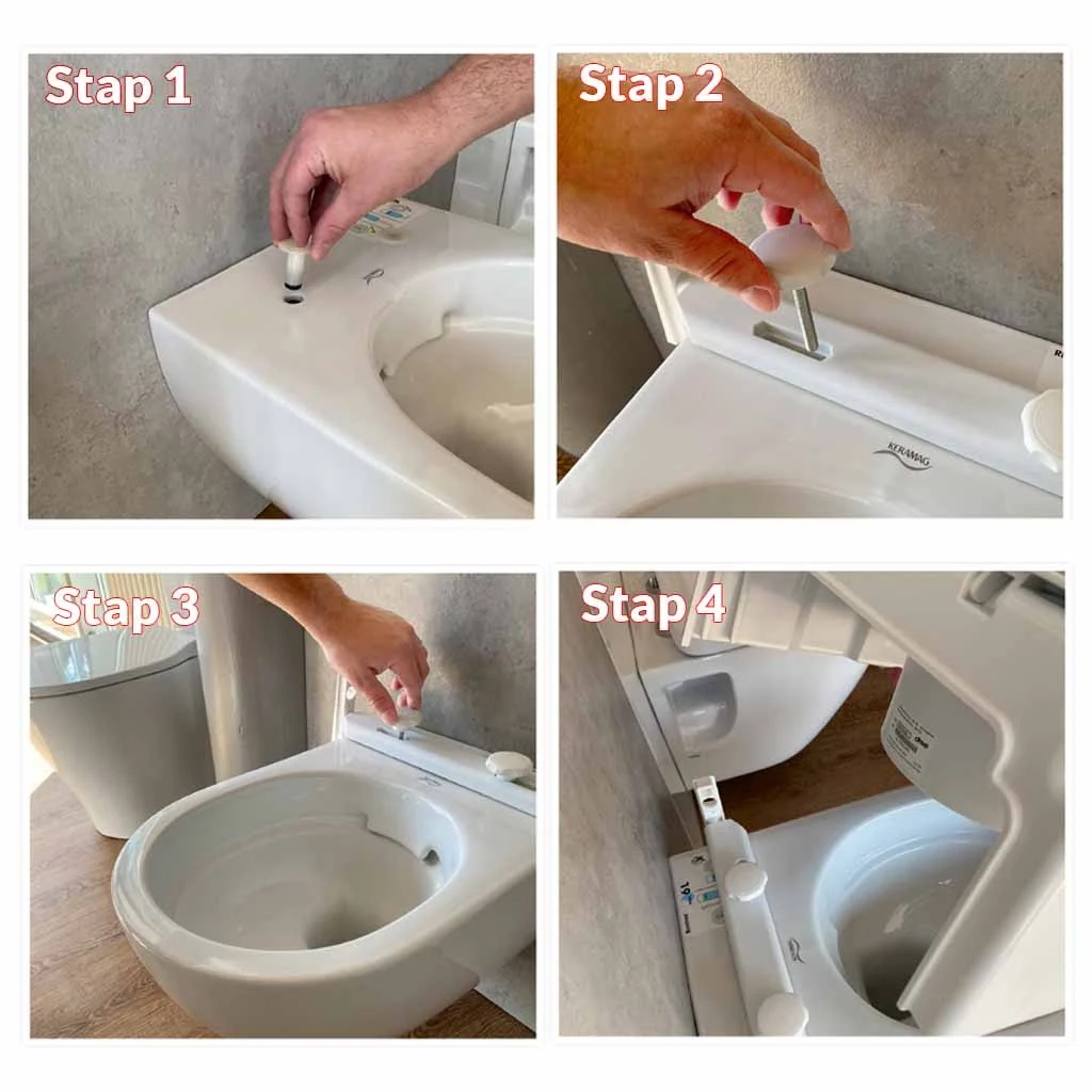 Het monteren is eenvoudig: verwijder eerst de oude wc-bril, plaats de toiletverhoger op het toilet, druk de meegeleverde pluggen in de gaten en draai ze vast. Je hebt geen gereedschap nodig.