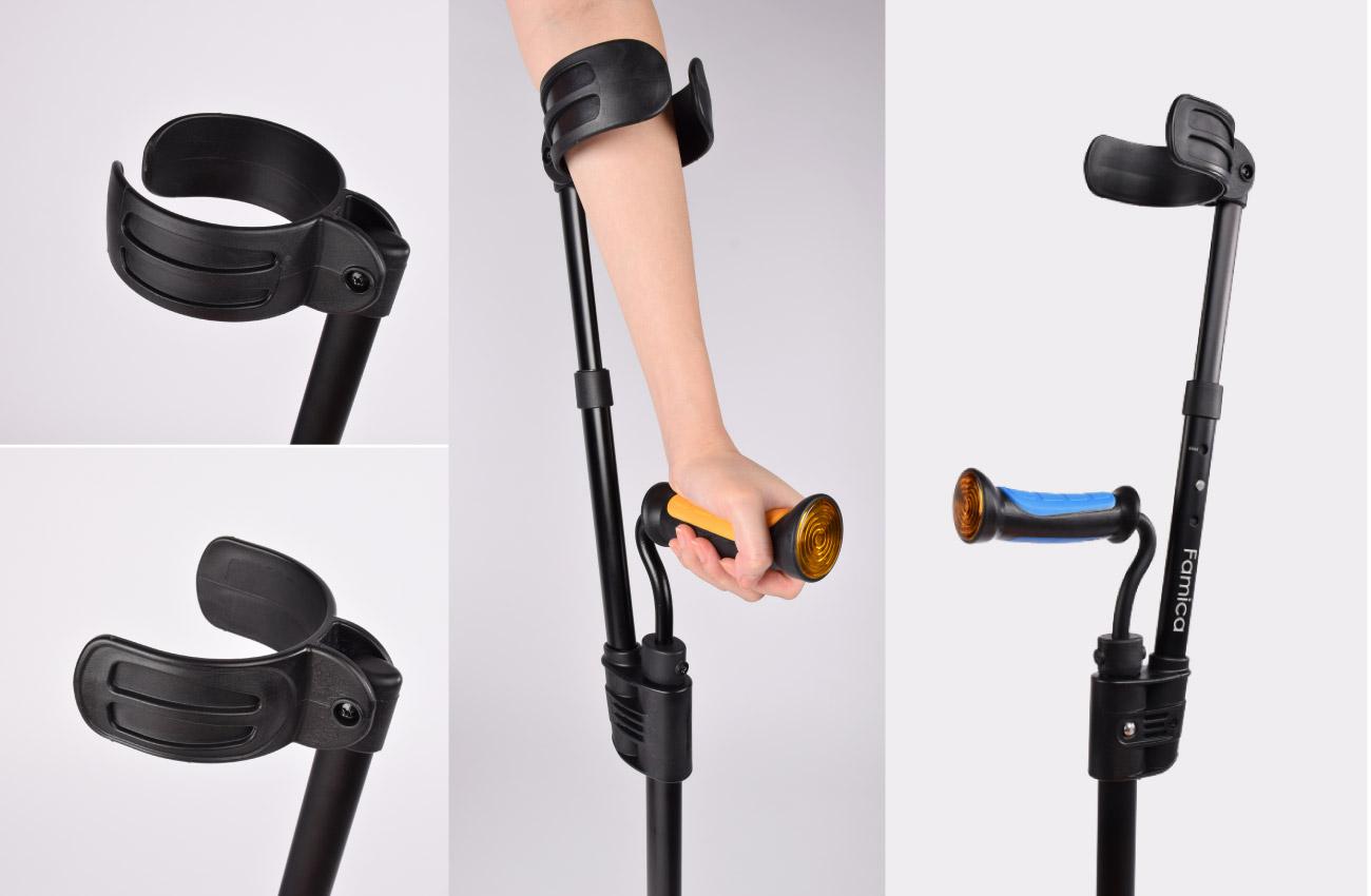 Het handvat van de inschuifbare elleboogkruk ligt zeer prettig in de hand en is druk ontlastend . Deze is in 3 kleuren verkrijgbaar . Voor in het handvat zit een reflector zodat u beter opvalt in het donker. Het matriaal van het handvat zorgt voor een juiste grip , ook als u natte of bezwete handen heeft.
