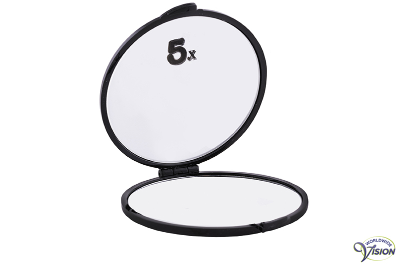 Het handige spiegeldoosje heeft aan de ene kant een normale spiegel en aan de andere kant een spiegel met 5x vergroting.