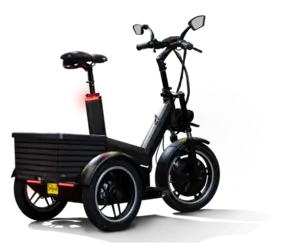 Het gepatenteerde kantelsysteem. Dit systeem zorgt ervoor dat je tijdens het fietsen automatisch mee kunt leunen in de bocht, vergelijkbaar met een gewone fiets. Het grote verschil? De stabiliteit van drie wielen blijft altijd behouden.