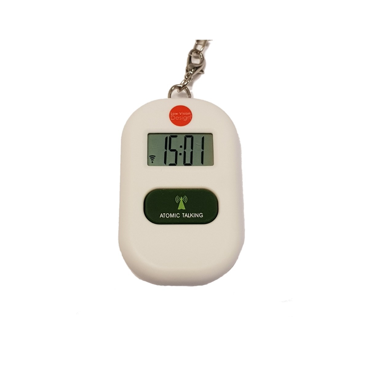 Deze sprekende Atomic sleutelhanger spreekt luid en duidelijk de tijd en datum uit . Door een druk op grote knop in het midden wordt de tijd en dagdeel op ieder gewenst moment uit gesproken.