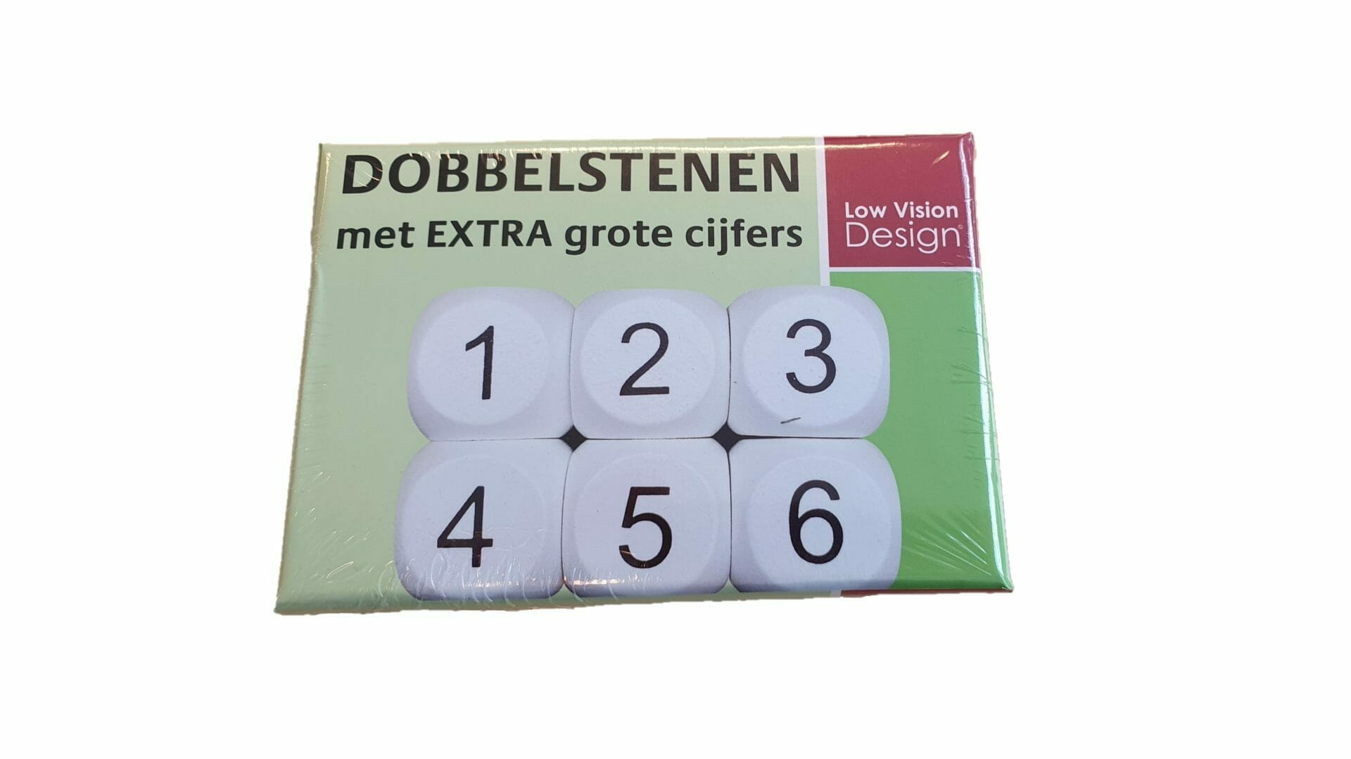 De Low Vision Design dobbelstenen XXL zijn grote duidelijke dobbelstenen met een grote cijfer opdruk. De witte achtergrond en zwarte bedrukking maakt een goed contrast wat duidelijk leesbaar is .