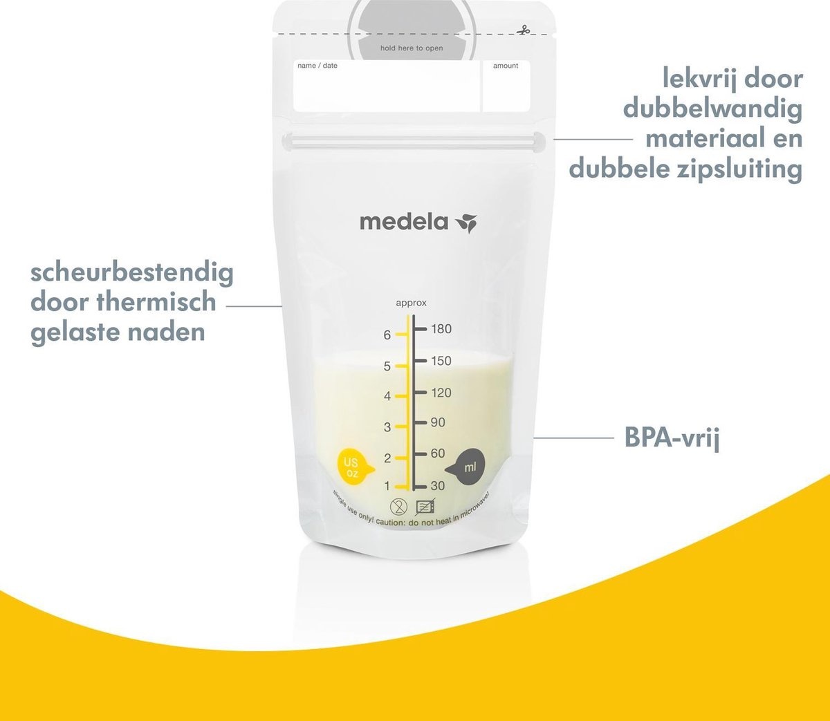 Met de Medela Moedermelk bewaarzakjes kun je moedermelk makkelijk bewaren in bijvoorbeeld vriezer of koelkast. U kunt de melk rechtstreeks afkolven in de bewaarzakjes. U vult het etiket in en legt ze in de koelkast of vriezer. De bewaarzakken zijn verkrijgbaar in een verpakking van 25 of 50 stuks met een inhoud van 180 ml.
