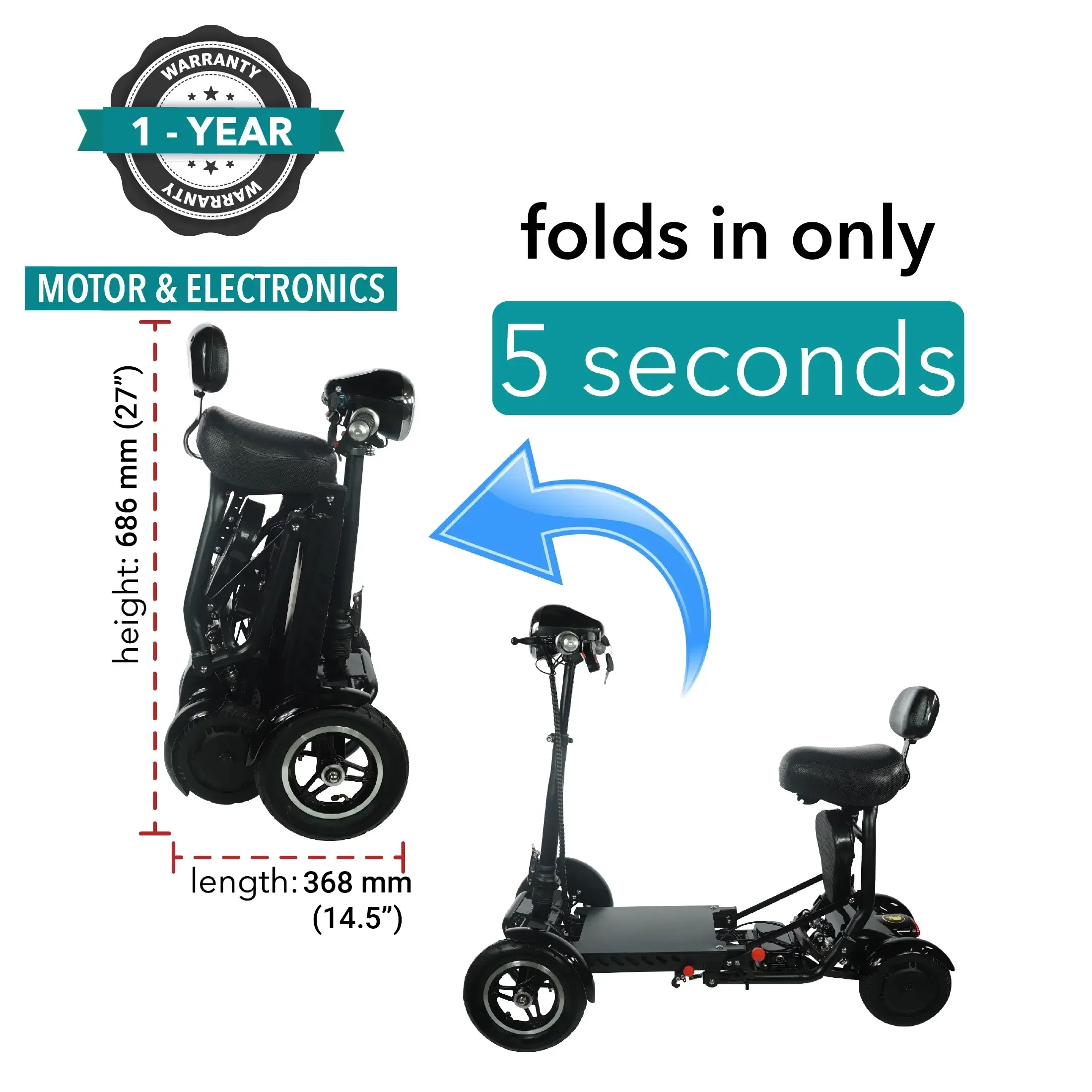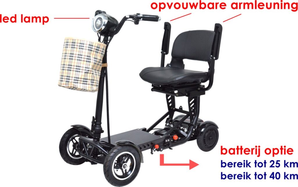 Het opvouwen van beide modellen is ontzettend eenvoudig. Aan de zijkant zit een knop waarmee je de scootmobiel in enkele seconden inklapt. Dit maakt het meenemen in de auto, camper of zelfs trein bijzonder makkelijk. Ook het opbergen in huis of in de schuur kost nauwelijks ruimte.