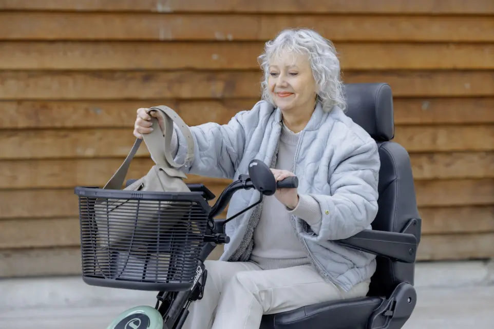 Stabiel op elk terrein: Dankzij de vier stevige wielen en slimme vering rijdt deze scootmobiel comfortabel over straatstenen, zandpaden en hellingen.