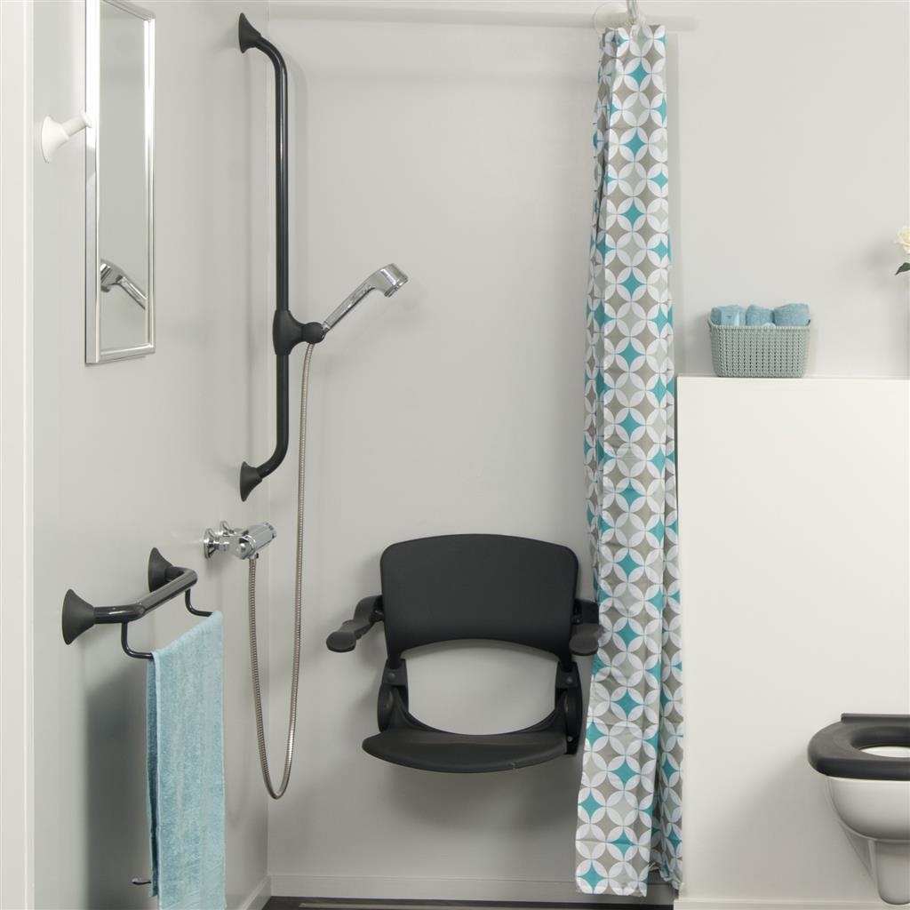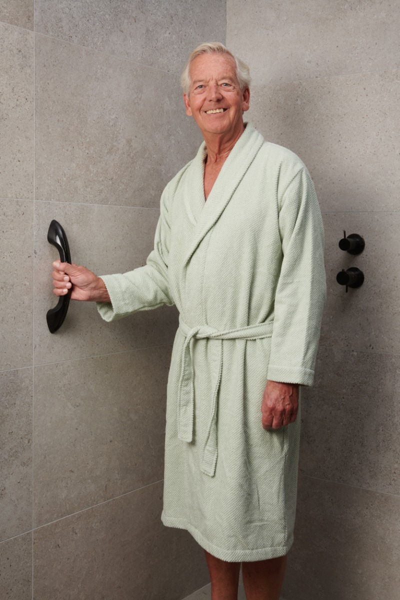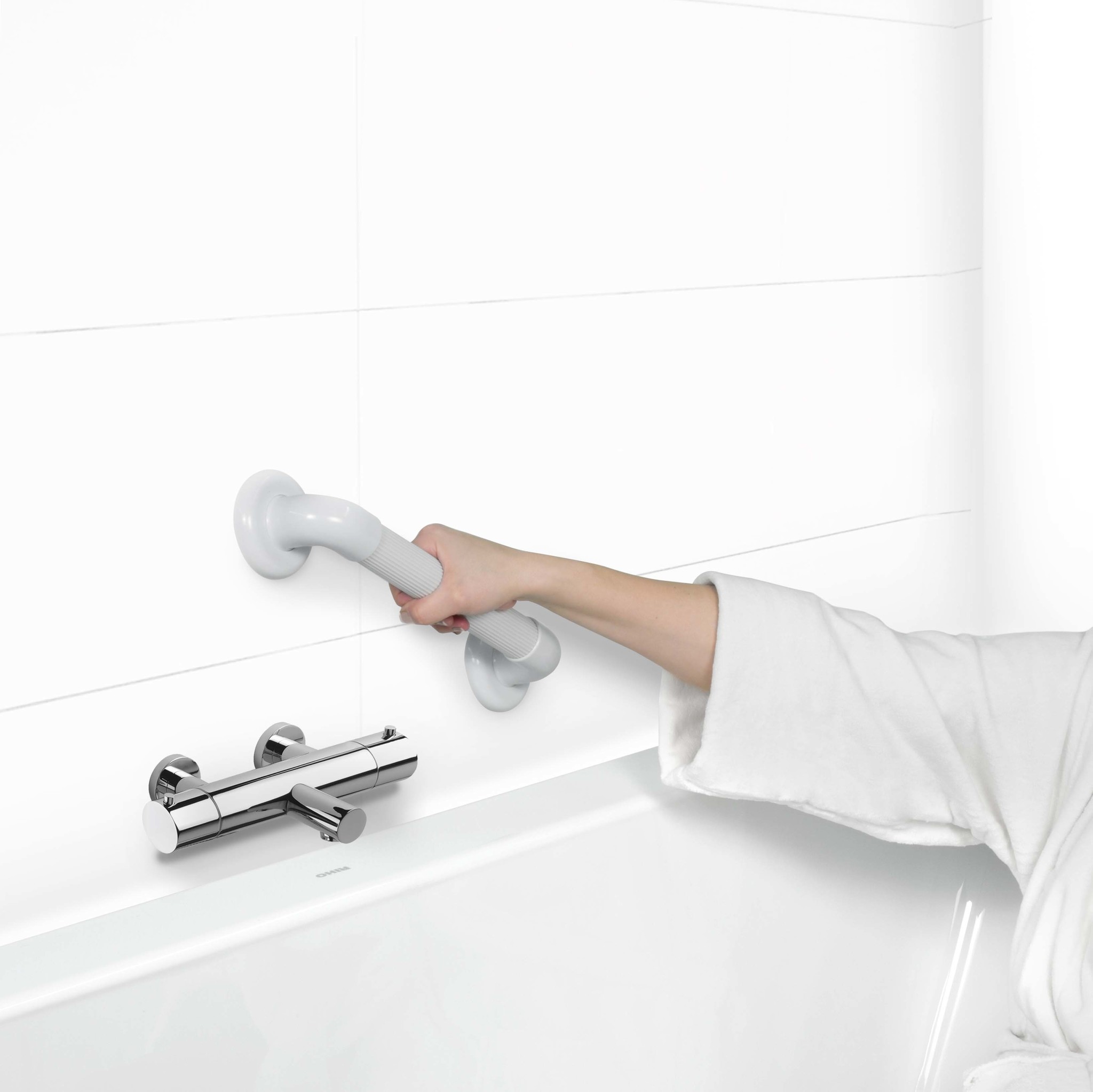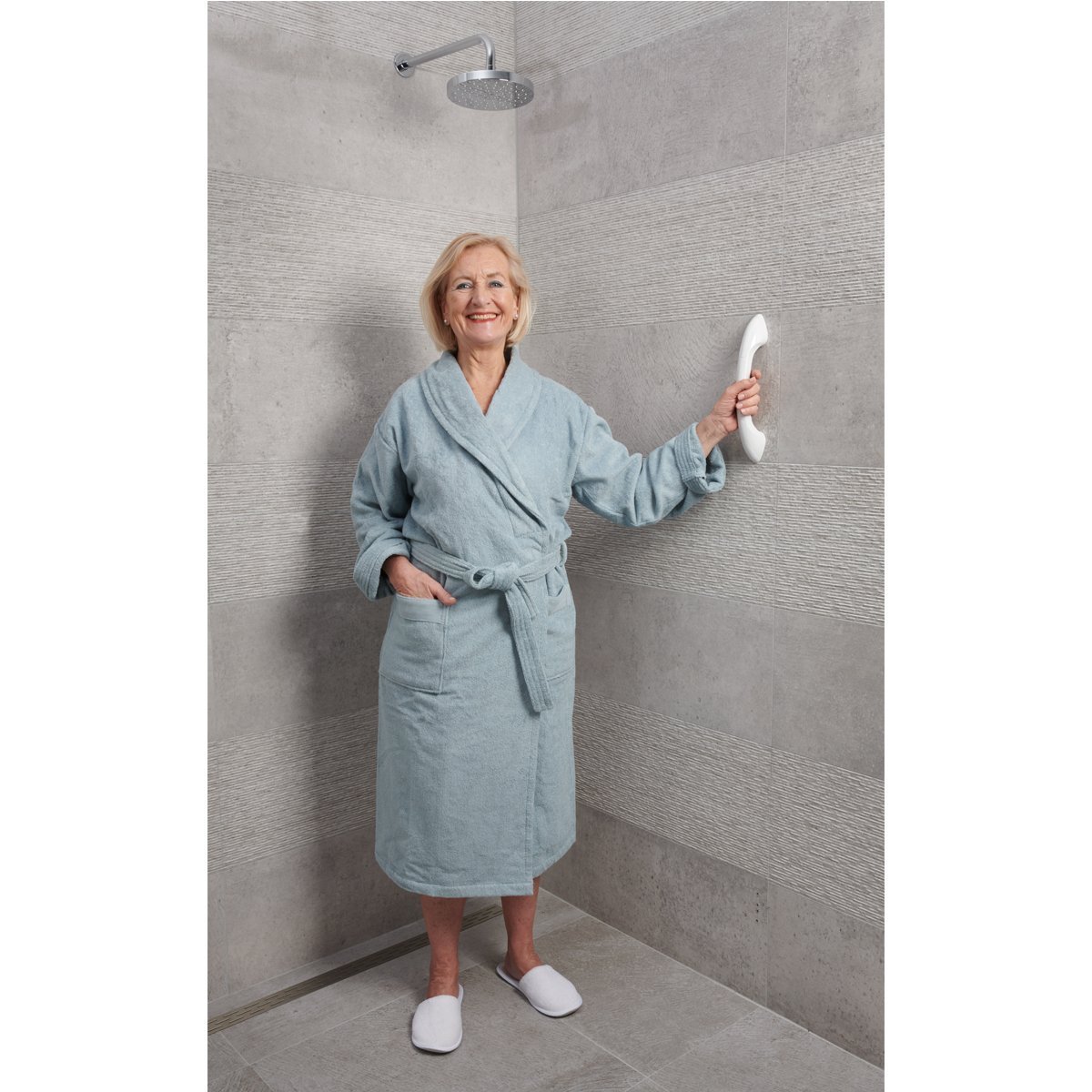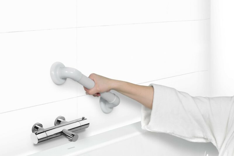 Een wandbeugel voor in de badkamer geeft steun en stabiliteit bij het staan in de badkamer. Zo kunt u veilig een transfer maken en heeft u hou vast bij bijvoorbeeld een afstapje of een gladde ondergrond. Bij het kiezen van een wandbeugel voor in de badkamer is het goed om te kiezen voor een waterbestendige wandbeugel. Deze zijn leverbaar in kunststof , aluminium , of staal met een speciale waterafstotende coating. Zo weet u zeker dat deze niet gaat roesten en de wandbeugel op de lange duur ook betrouwbaar blijft. Zorg ook voor het bevestigen voor RVS schroeven zodat deze ook veilig en stevig blijven op de lange termijn als deze met vocht en water in aanraking komen. De lengte van de wandbeugel is afhankelijk van de plek in de badkamer waar deze komt te hangen en of u met de beugel mee wilt lopen of dat deze op 1 punt steun moet geven. Wilt u liever niet boren in de badkamer ? Dan kunt u kiezen voor een wandbeugel op zuignap. let er wel op dat u deze 1 x in de twee weken even los maakt en weer vast klikt. Een wandbeugel met zuignap dient vol op de tegel te komen en mag niet over de voeg lopen. Ook dient de tegel volledig glad te zijn en mag deze geen oneffenheden bevatten.