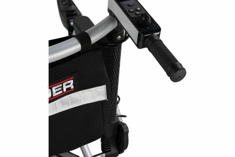 De besturing van de Splitrider rolstoel is simpel en eenvoudig en gaat via een joystick die zowel links als rechts te plaatsen is. Optioneel is er ook een elektrische achterloopset verkrijgbaar zodat de besturing geheel elektrisch aan de achterzijde door een begeleider kan plaats vinden. U kunt dan switchen tussen besturing voor en achter wanneer u dit wilt.