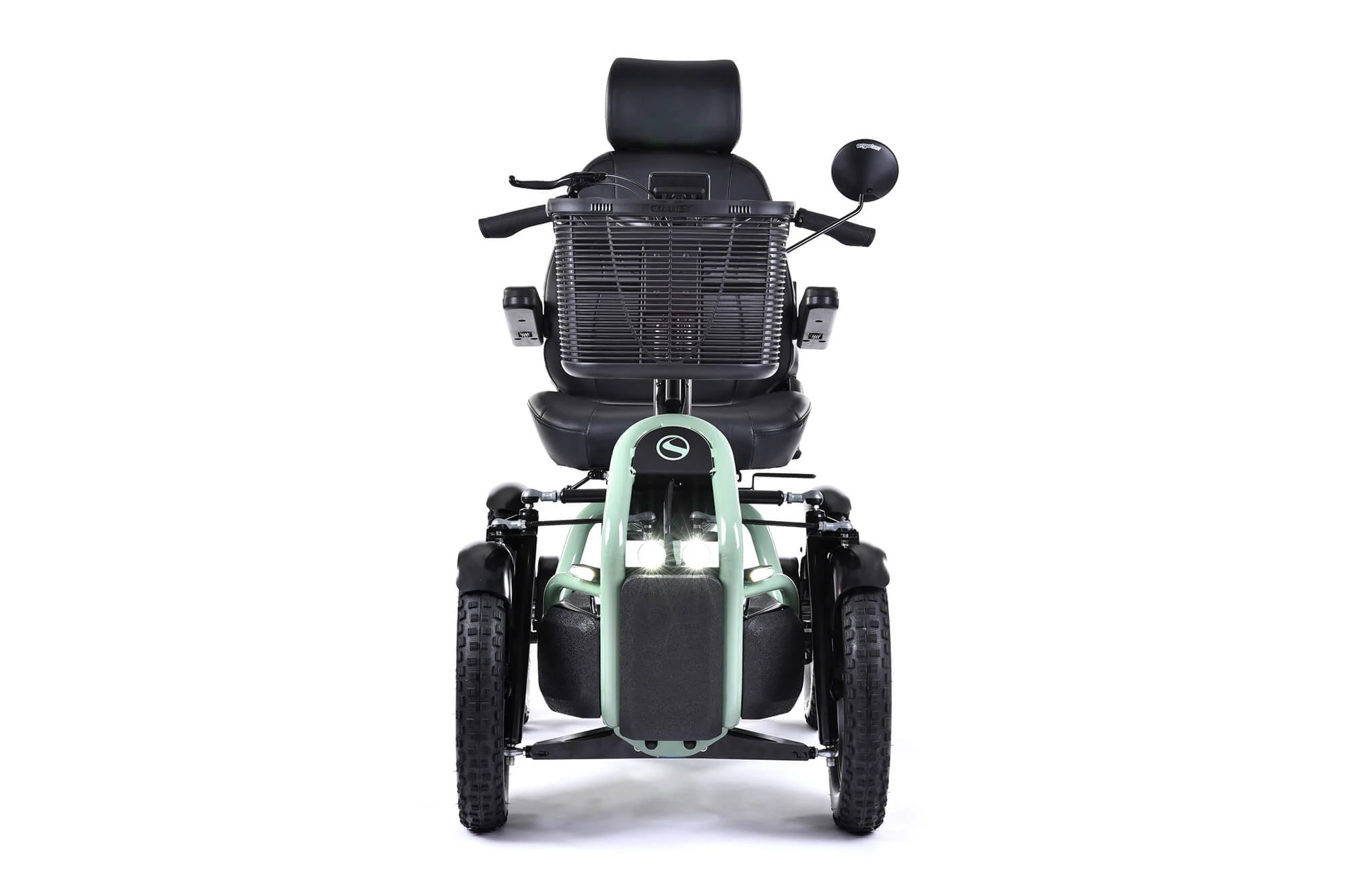 De scootmobiel is uitgerust met vier grote luchtbanden die zorgen voor goede grip, ook op grind, gras of onverharde paden.