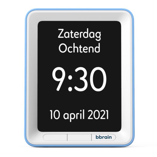 De andere dementieklokken zijn op netstroom, deze schermen zijn vaak nog naar helderheid aanpasbaar daardoor wordt de tijd/dag erg duidelijk weergegeven. Het voordeel hiervan is ook dat deze kalenderklokken in meerdere verschillende weergaves instelbaar zijn. Voor slechthorenden kan het bij sommige kalenderklokken ook mogelijk zijn om de tijd, datum en dag te laten uitspreken. Dit kan bij de BBRAIN sprekende kalenderklok ook in combinatie met herinnering meldingen. Bijv. een herinnering dat het tijd is voor de inname van u medicijnen, dit wordt dan weergegeven op het scherm en kan tevens ook uitgesproken worden. Wanneer de tijd aflezen helemaal niet meer mogelijk is, hebben wij ook een drukknop klok in het assortiment. Deze heeft een grote blauw knop, wanneer hier 1x op gedrukt wordt spreekt deze de tijd uit en wanneer u nogmaals drukt spreekt deze ook de dag en datum uit.