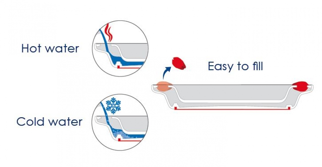 - Makkelijk te vullen met warm of koud water door de grote vulgaten