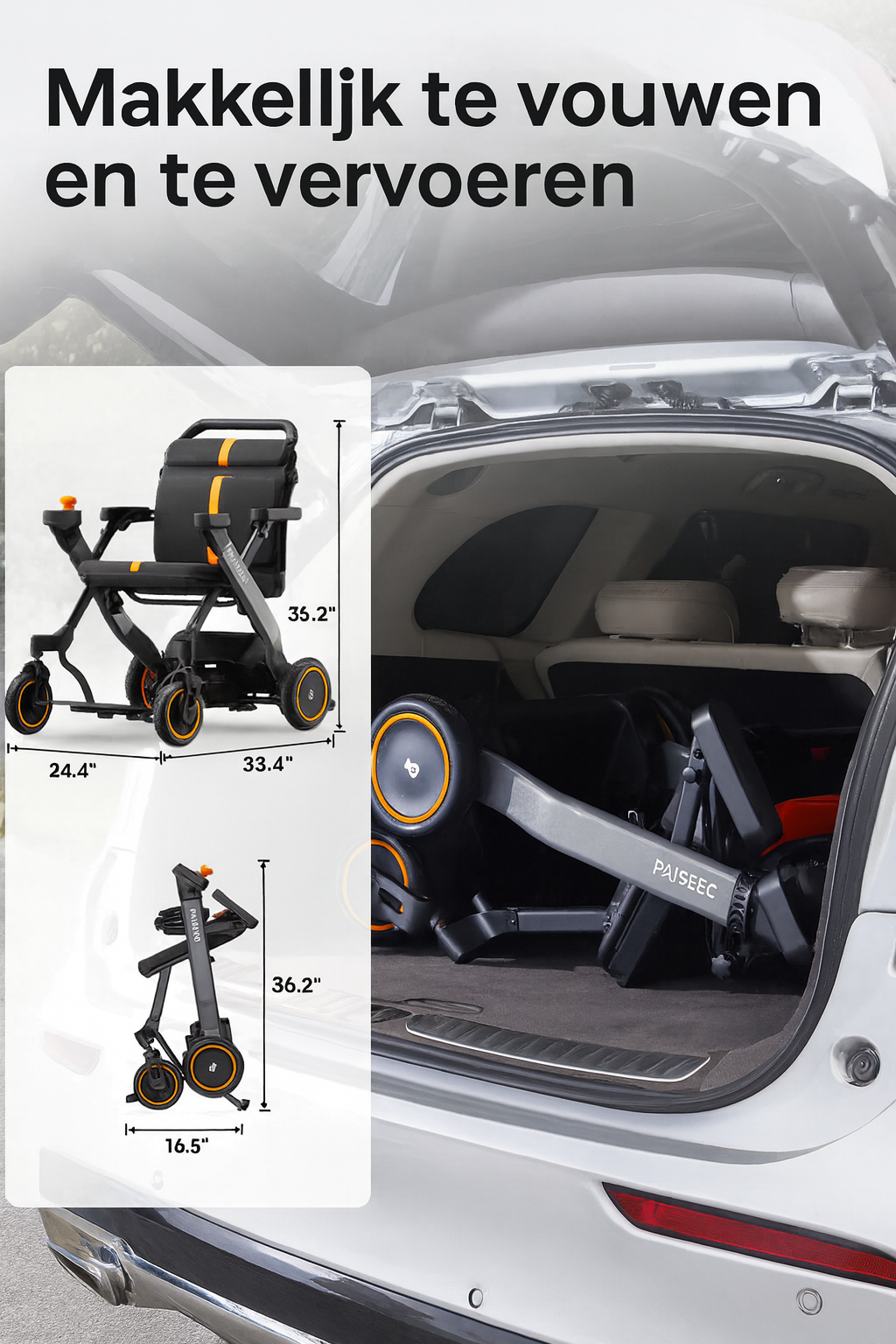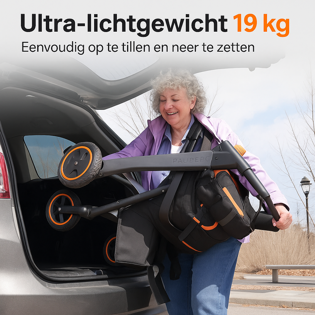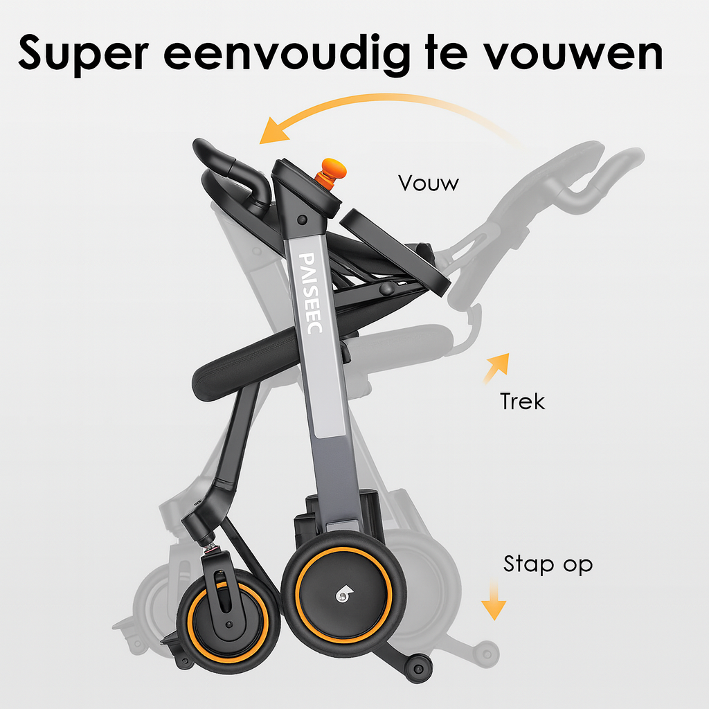 Met een gewicht van slechts 22,5 kg is de Paiseec makkelijk op te vouwen en mee te nemen. Dankzij de krachtige lithiumaccu rijd je tot wel 25 kilometer op één lading, met een maximale snelheid van 6 km/u. De snelheid is eenvoudig instelbaar naar wens, waardoor je altijd veilig en comfortabel beweegt.