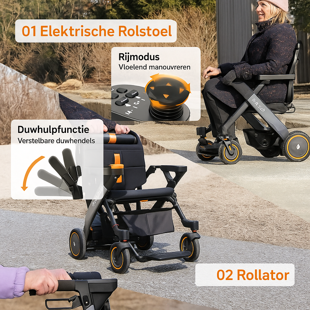 Deze opvouwbare elektrische rolstoel combineert drie functies in één hulpmiddel: een elektrische rolstoel, een slimme elektrische transportstoel en een slimme rollator. Eén apparaat met drie mogelijkheden, speciaal ontworpen om jou in het dagelijks leven maximale vrijheid en gemak te bieden.