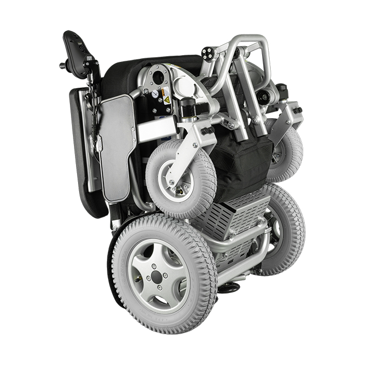 Uniek voor een elektrische rolstoel met zo hoog draagvermogen is dat deze binnen 2 seconden op te vouwen en te vervoeren is