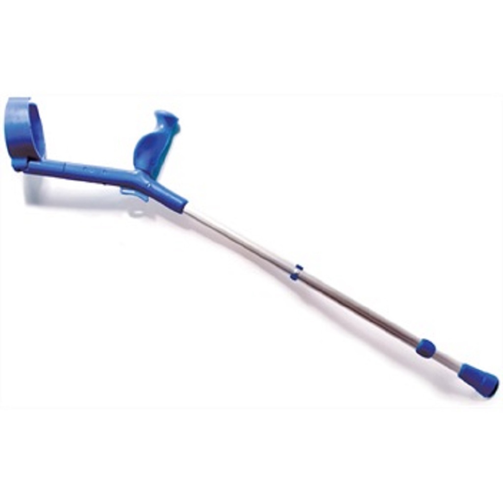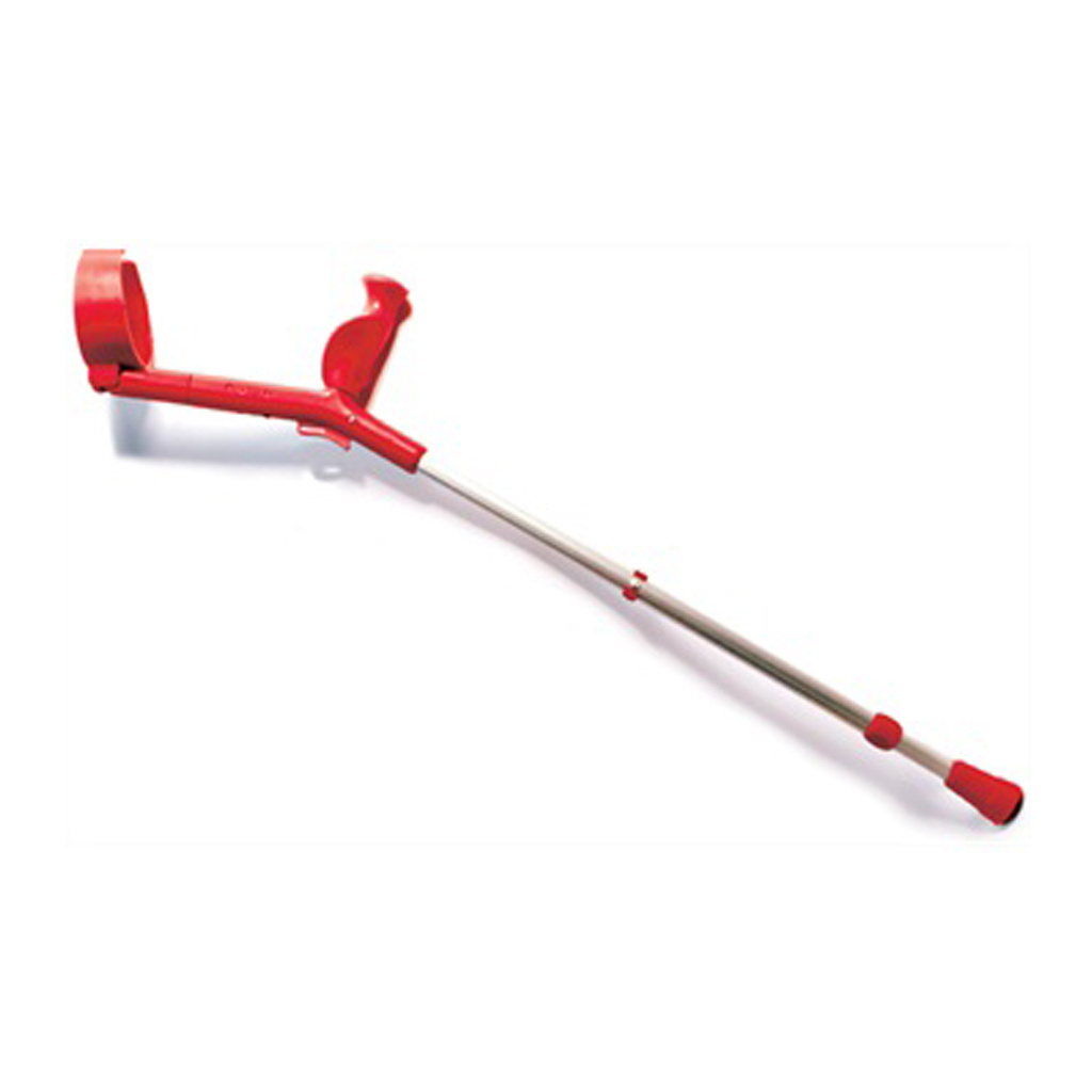 De gekleurde elleboogkrukken zijn leverbaar in rood, blauw en zilver.