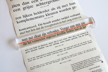 Leg de liniaal gewoon op de tekst en schuif deze rustig mee terwijl je leest. Dankzij de ergonomische uitsparing aan de onderzijde ligt de liniaal prettig in de hand en beweeg je hem moeiteloos over de pagina heen.