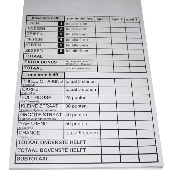 Er zitten 3 spellen per bladzijde op het grootletter yahtzee scoreblok