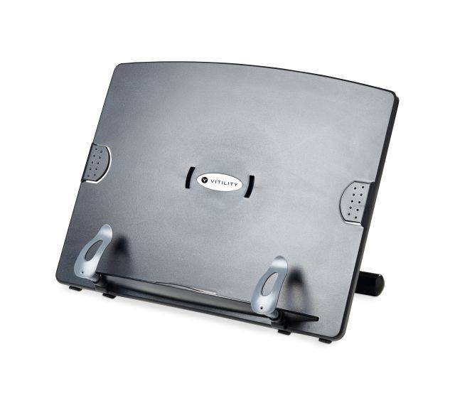 De Vitility leesstandaard is stevig en makkelijk te verplaatsen. De boekenplank kan zowel liggend als staand gebruikt worden door het flexibele kantel mechanisme. De klemmen die het boek vast houen kunnen versteld worden zodat u bijvoorbeeld een los papiertje hierop kunt plaatsen. De boekenstandaard zorgt voor rust tijdens het lezen en voorkomt nekklachten. Wilt u de boekenstandaard meenemen ? Dan kan deze opgevouwen worden en is deze makkelijk op te bergen.