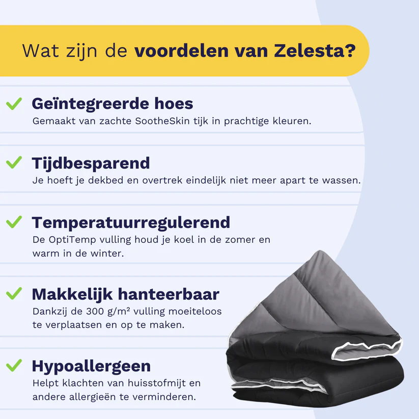 Wil je zelf het gemak en comfort van de Zelesta RoyalBed Zwart & Antraciet ervaren? Bestel vandaag nog en geniet elke nacht van een fris, hygiënisch en stijlvol dekbed – het hele jaar door.